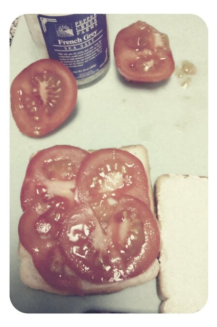 Not very "seasonal," but I was dying for a tomato sandwich today. Fortunately, I had a beautiful overpriced tomato from Wholefoods that did the job. :) What better way to enjoy this tomato than to dedicate a whole sandwich to it?! A little mayo, a little french grey sea salt - perfection! :)