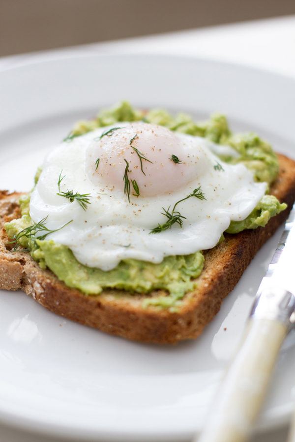 Poached egg over seasoned avocado, olive oil, wheat toast and topped with salt and pepper and dill. I modified it a little bit to suit my fridge (wheat bread and fresh dill as substitutes) and left off what I didn't have.