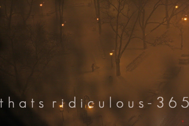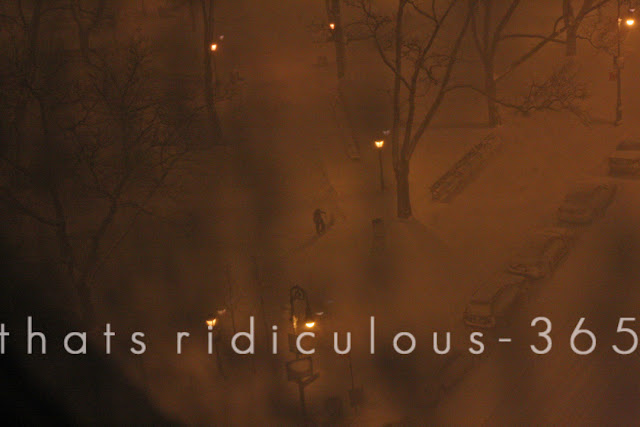 It had been a few minutes. A lot longer than I expected in this weather. So I looked out the window into the park and I didn't see anything. Where are they?! And then I see it. This lunatic man STANDING in the park, in a BLIZZARD. I couldn't believe it. I got my camera to take a picture through the ice covered window (sorry for the blur) and as I focused in, I saw something else - a DOG!? And then I realized... it was my lunatic husband and dog - gallivanting through the park in a blizzard.