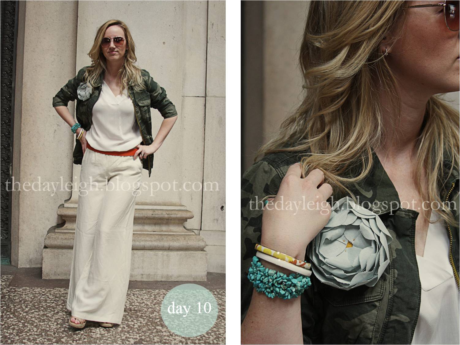 I really like camo... on other people. The way you've worn it here is very classy! I love the contrast of it with the neutrals in your base outfit. The pants are phenomenal and very feminine.