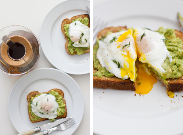 Poached egg over seasoned avocado, olive oil, wheat toast and topped with salt and pepper and dill. I modified it a little bit to suit my fridge (wheat bread and fresh dill as substitutes) and left off what I didn't have.